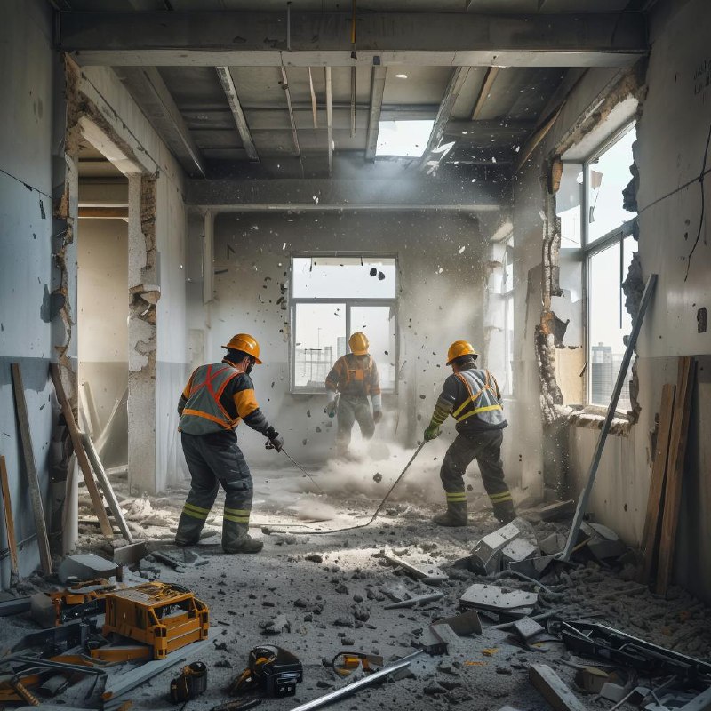 - Снос: Используют инструменты, такие как перфораторы, отбойные молотки и пневматические молоты. Для бетонных перегородок могут потребоваться алмазные диски для точного реза.